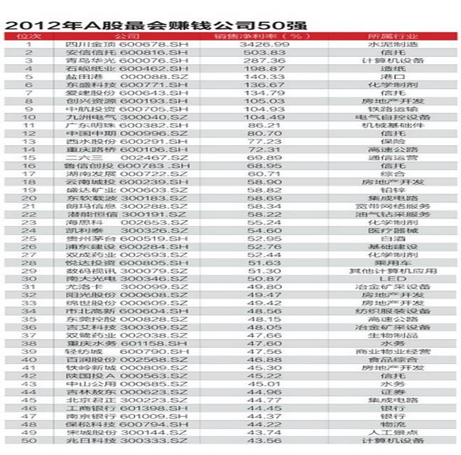 在《中國經濟周刊》統(tǒng)計的2012年A股凈利潤排名前100家公司,即“2012年A股最賺錢公司100強”中,有我們熟悉的擁有壟斷資源的企業(yè),如銀行和石油,也有一些不具備壟斷資源的“小個頭”公司,他們憑借其在行業(yè)內的領先地位一舉擠進最賺錢公司排行榜。